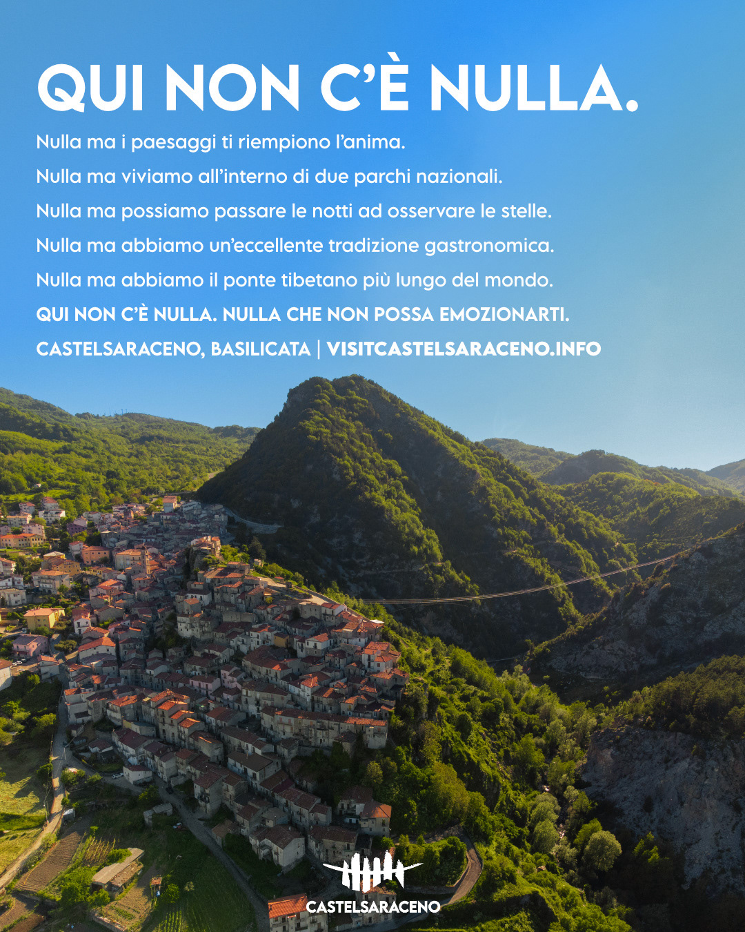 Realizzazione della campagna pubblicitaria QUI NON C'È NULLA per Visit Castelsaraceno uscita su Dove Viaggi, Bell'Italia, 7 e i vari canali social.